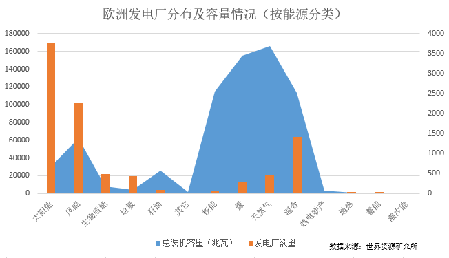 数量最多的太阳能电厂的装机容量仅占全欧洲容量的4.4%,风能仅占9%。而逐渐被欧洲新能源战略抛弃的煤电厂占总装机容量的22.8%,天然气电厂占24.4%,利用石油发电的容量占3.8%。