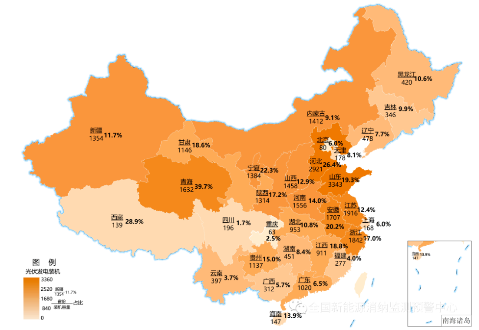 截至2021年底各地区累计光伏发电装机(万千瓦)及占本地区总装机比重
