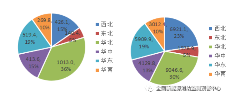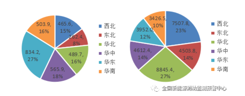四季度各区域新增(左)、累计(右)并网光伏发电装机(万千瓦)