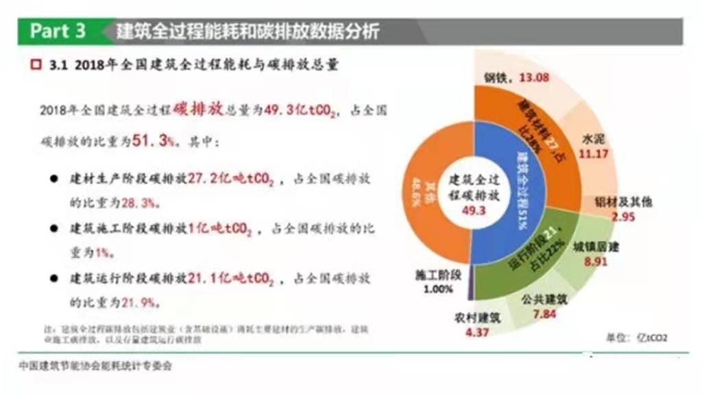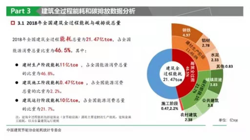 根据数据统计,2018年全国建筑全过程能耗总量为21.47亿tce,占全国能源消费总量比重为46.5%。2018年全国建筑全过程碳排放总量为49.3亿tCO2,占全国碳排放的比重为51.3%。