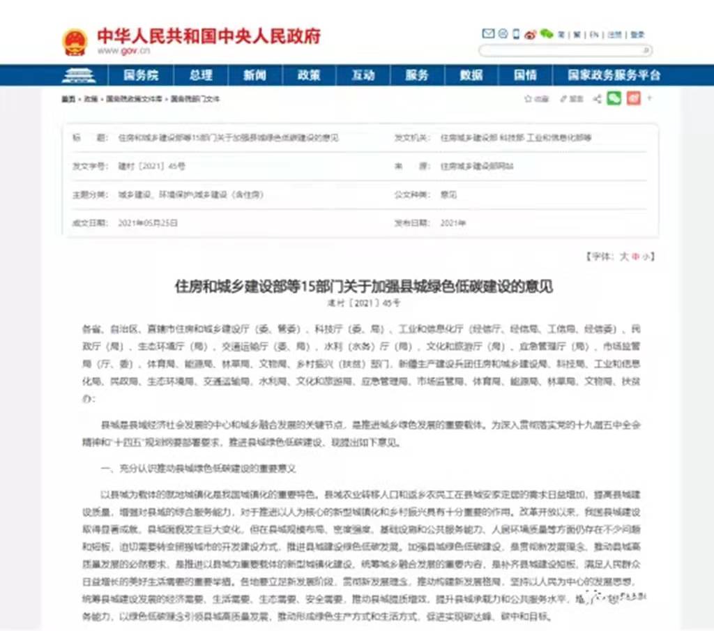 1、2021年5月25日,住建部、生态环境部等15部门发布《关于加强县城绿色低碳建筑的意见》,明确要大力发展绿色建筑和建筑节能。县城新建建筑要落实基本级绿色建筑要求,鼓励发展星级绿色建筑。加快推行绿色建筑和建筑节能节水标准,加强设计、施工和运行管理,不断提高新建建筑中绿色建筑的比例。加快推进绿色建材产品认证,推广应用绿色建材。发展装配式钢结构等新型建造方式。全面推行绿色施工。通过提升新建厂房、公共建筑等屋顶光伏比例和实施光伏建筑一体化开发等方式,降低传统化石能源在建筑用能中的比例。