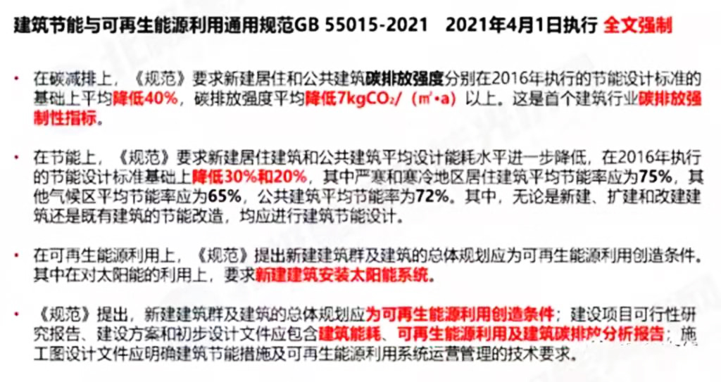 2、2021年9月8日,住房和城乡建设部发布国家标准《建筑节能与可再生能源利用通用规范》的公告。批准《建筑节能与可再生能源利用通用规范》为国家标准,编号为GB 55015-2021,自2022年4月1日起实施。本规范为强制性工程建设规范,全部条文必须严格执行。现行工程建设标准相关强制性条文同时废止。建筑碳排放计算作为强制要求,意向重大,将直接影响建筑行业和BIPV的发展。