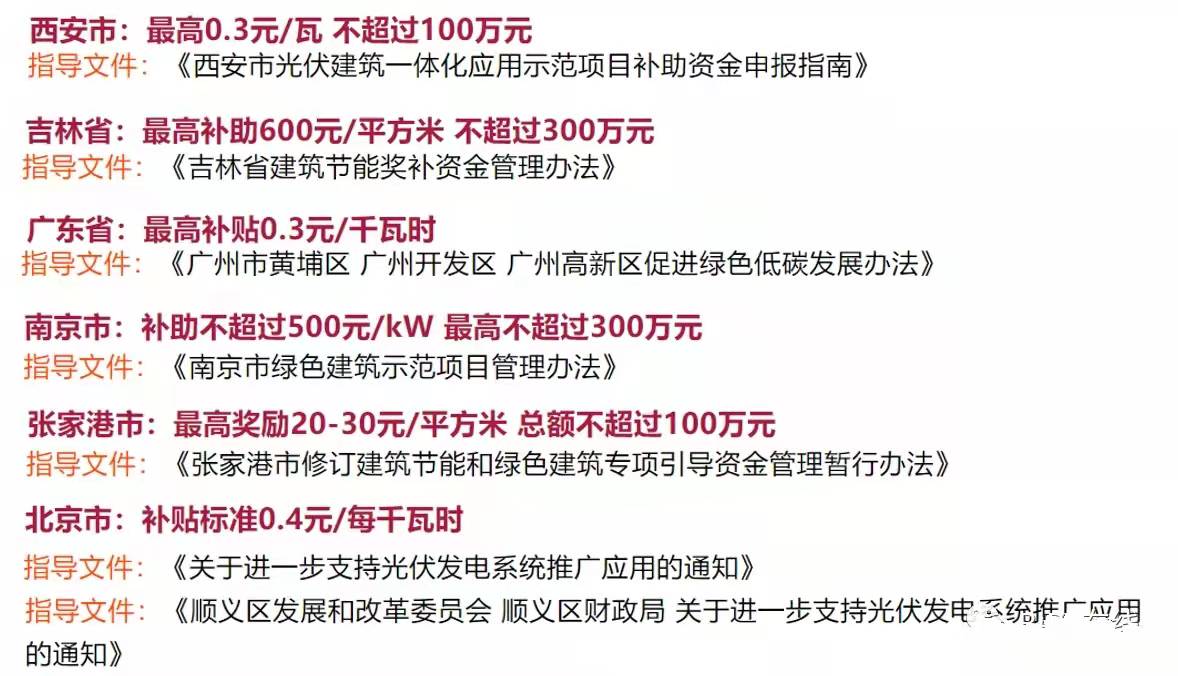 4、支持建筑光伏一体化发展的地方政策不断出台,目前吉林、广东、江苏、西安、深圳等十几个省市明确发布了BIPV或绿色建筑相关补贴政策,补贴力度从0.3-0.4元/度,补助限额从100-300万元各有不同。