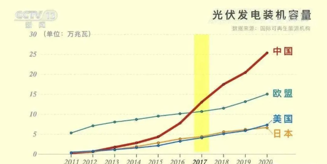 2011年,中国的装机容量仅为日本、美国的六成,为欧盟的6%。从2013年起,国家加大节能减排力度,光伏产业快速发展。到2017年,中国的装机容量就超过了整个欧盟的总和。