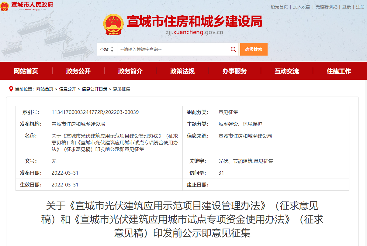 3月31日,宣城住建局官网发布“关于《宣城市光伏建筑应用示范项目建设管理办法》(征求意见稿)和《宣城市光伏建筑应用城市试点专项资金使用办法》(征求意见稿)印发前公示即意见征集”。