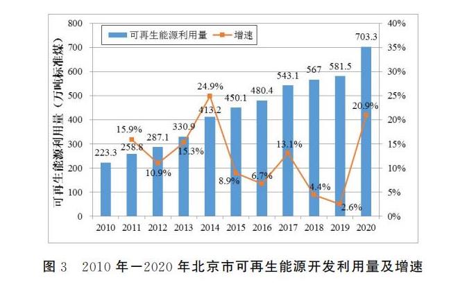 积极探索可再生能源与城市重点区域开发、基础设施建设、产业园区融合发展新路径,制定出台鼓励热泵、光伏利用等政策措施,全市可再生能源规模化利用加快推进。2020年,全市可再生能源开发利用折合703.3万吨标准煤,占能源消费比重由2015年的6.6%提高到10.4%,超过“十三五”规划8%的目标。外调绿电规模成倍增加,由2015年的45亿千瓦时大幅增加到2020年的145.6亿千瓦时,占全社会用电量比重达到12.5%。
