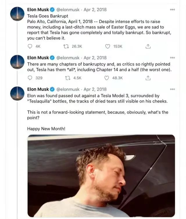 2018年的愚人节就更不得了了,马斯克直接发推特称: