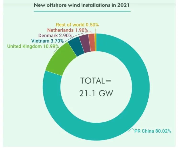 国补取消前夕,2021年“抢装潮”后,我国海上风电新增装机取得了10.8GW的优异成绩!在全球海上风电中超越英国位居第一,增量占比80%,一枝独秀。