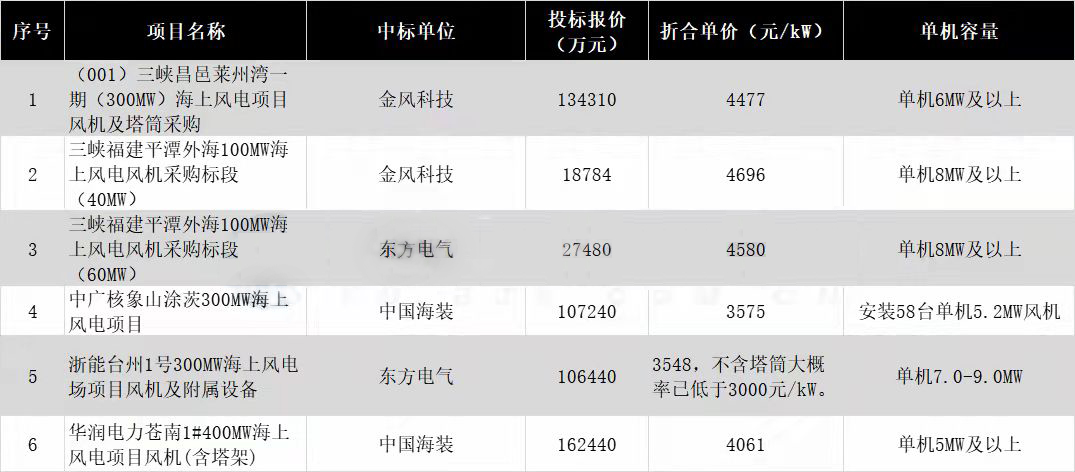 从上图可以看到,浙能台州1号海上风电场、中广核象山涂茨海上风电场、华润电力苍南1#海上风电项目均为低价,风机最低价为3548元/kW(含塔筒)。
