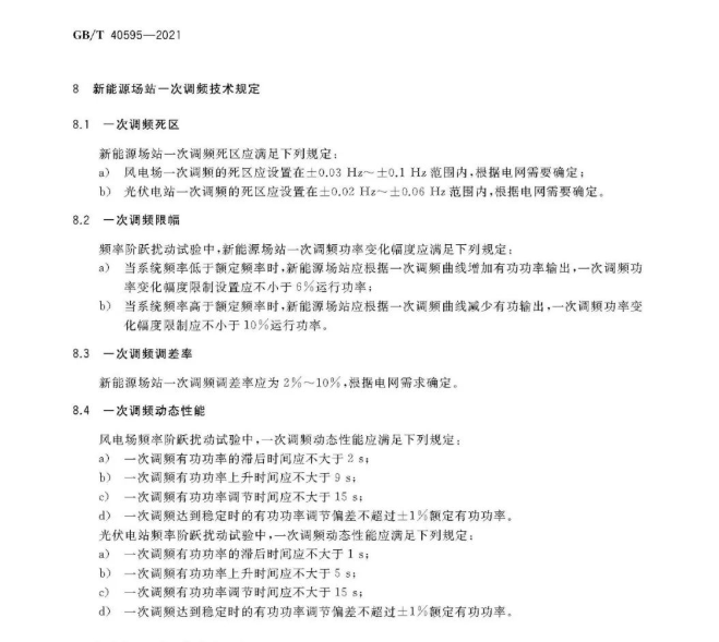 2021年10月11日, 国家标准《并网电源一次调频技术规定及试验导则》(GB/T40595-2021)正式发布,该文件将于今年的5月1日开始实施,文件明确:接入35kV及以上电压等级的储能电站、风电、光伏等并网电源要按照该文件执行。其中光伏电站一次调频动态性能应满足下列规定: