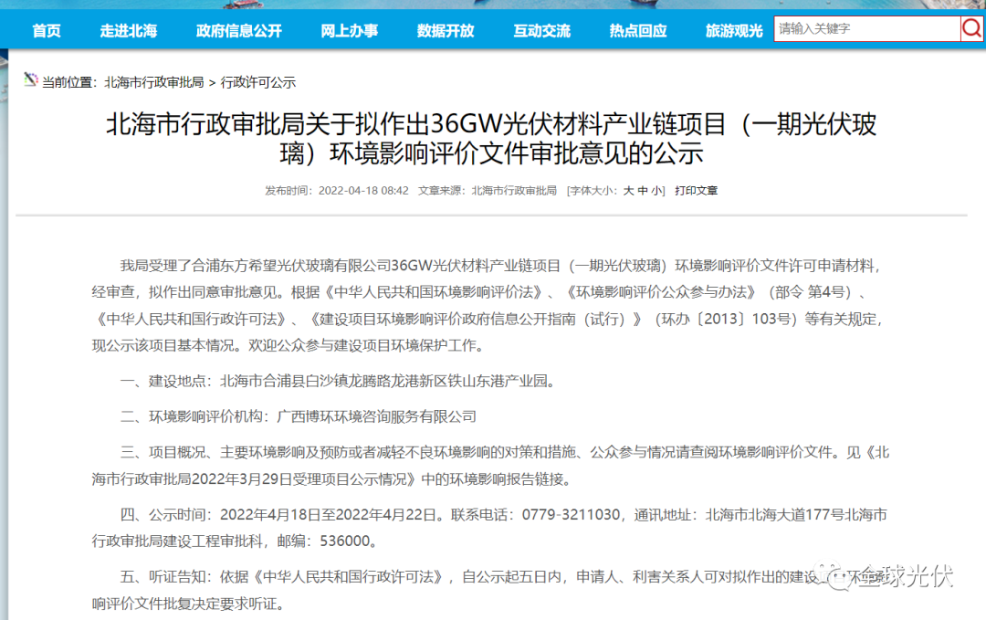 4月18日,北海市行政审批局发布关于拟作出36GW光伏材料产业链项目(一期光伏玻璃)环境影响评价文件审批意见的公示,主体为合浦东方希望光伏玻璃有限公司,建设地点为北海市合浦县白沙镇龙腾路龙港新区铁山东港产业园。