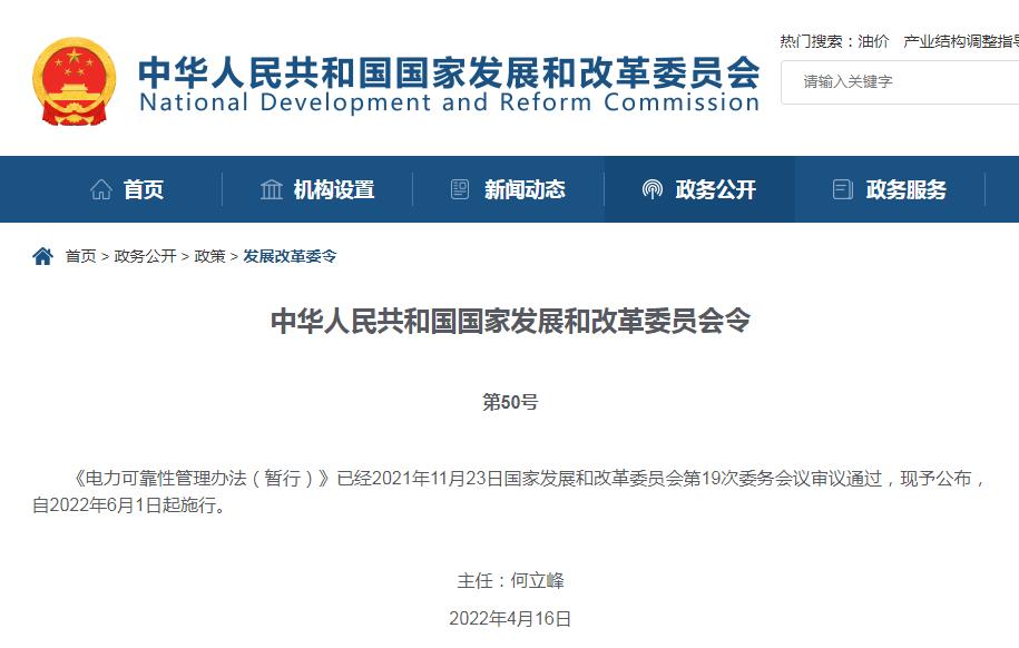 4月25日,国家发改委发布《电力可靠性管理办法(暂行)》。《办法》提出,积极稳妥推动发电侧、电网侧和用户侧储能建设,合理确定建设规模,加强安全管理,推进源网荷储一体化和多能互补。建立新型储能建设需求发布机制,充分考虑系统各类灵活性调节资源的性能,允许各类储能设施参与系统运行,增强电力系统的综合调节能力。