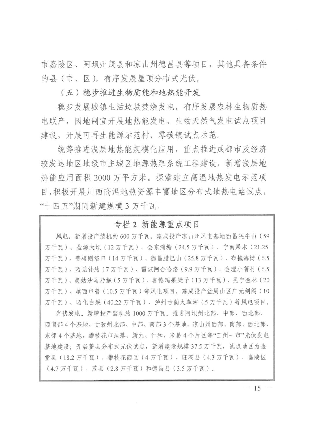 《规划》表示,2025年,可再生能源高质量发展取得新进展。“十四五”新增风电约600万千瓦,光伏发电约1000万千瓦。重点推进“三州一市”光伏发电基地建设,加快推进凉山州风电基地建设等。积极推动水电与风电、太阳能发电协同互补,推进金沙江上游、金沙江下游、雅砻江流域、大渡河中上游等水风光一体化可再生能源综合开发基地建设。加快新型储能示范推广。鼓励建设超高海拔风电、光伏发电实证实验基地、光伏储能试点项目。