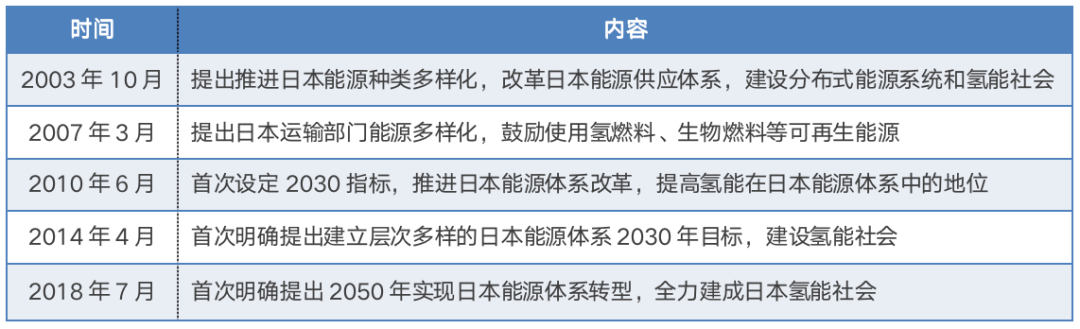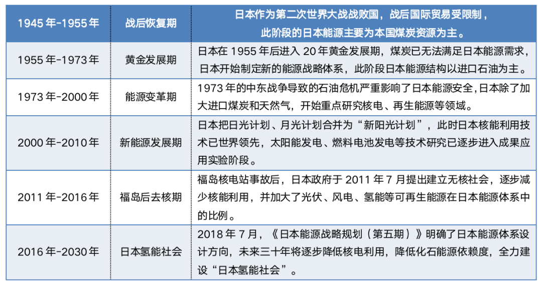 氢能在日本能源战略规划中占有极其重要地位,自第二次世界大战以来,日本能源体系发展自大致经历了六个阶段,日本近十年陆续制定《日本再复兴战略》《氢能与燃料电池战略发展路线图》《日本能源战略规划》等一系列政策,发展氢能已提升为日本国策,日本将建设全球第一个全面利用氢能的国家。