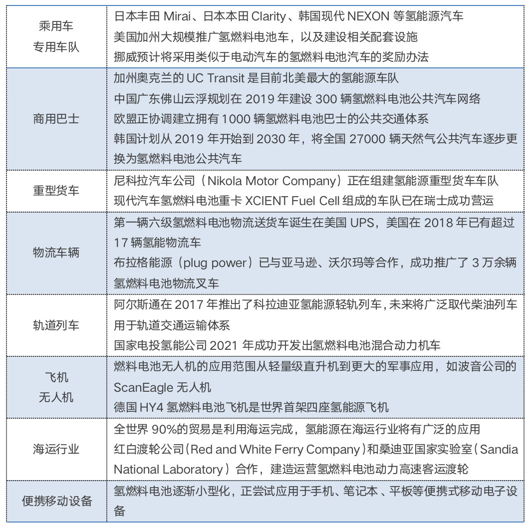 国际氢能政策及未来愿景是让氢能协助改善全球能源系统,应对气候变化,保障世界经济的可持续发展,国际氢能政策和应用在未来仍会延续既有趋势,继续加强制氢、储氢输运、氢加注、氢能终端利用等环节的研究与发展。世界各国的氢能研究者和参与者也在不断加强氢能技术研究交流、广泛实施氢能应用的开发示范项目,并尝试进行氢能应用场景的构建,虽然氢能应用场景目前尚处在早期,但已大致可分为乘用车专用车队、商用巴士、重型货车、物流车辆、轨道列车、飞机(无人机)、海运行业、便携移动设备等几大类。