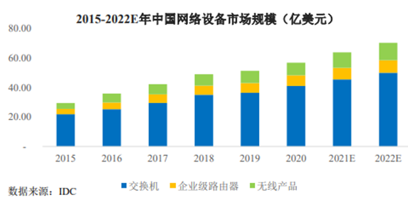 我国的网络设备市场规模整体上呈增长趋势,其中交换机和无线产品是市场增长的主要驱动因素。根据IDC数据显示,2021年上半年,我国交换机市场规模为20.83亿美元,同比增长17.06%;企业级路由器市场规模为3.58亿美元,同比增长17.90%。