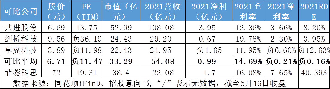 根据公司的招股意向书,菲菱科思的可比上市公司有共进股份、剑桥科技和卓翼科技。截至5月16日收盘,同花顺数据显示,仅共进股份市盈率为正值,其动态市盈率为13.75倍;而通信终端设备制造行业的动态市盈率为31.22倍。也就是说,菲菱科思对可比公司没有估值优势,但是对于整个行业有一定的估值优势。
