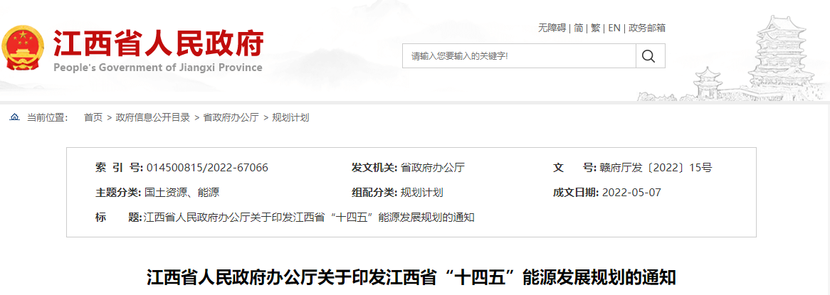 日前,江西省人民政府印发《江西省“十四五”能源发展规划》的通知。