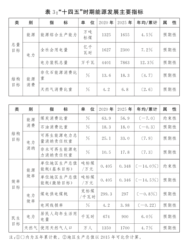 效率目标。到2025年,单位地区生产总值能耗五年累计下降14%,力争达到14.5%,积极争取能源消费总量弹性空间。煤电平均供电煤耗下降至297克标煤/千瓦时;电网线损率下降到3.98%以下。电力需求侧响应能力达到最大用电负荷的5%。
