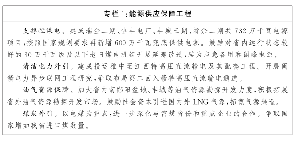 电力方面。统筹发展与安全,坚持需求导向,推动省内省外并重发展,着力构建多元清洁的电力供给体系。“十四五”新增电力装机容量3460万千瓦以上。充分发挥支撑电源兜底保供作用,有序推进已核准清洁煤电建设,争取国家支持建设新增支撑性清洁煤电项目。加强应急备用和调峰电源能力建设,推动煤电向基础保障性和系统调节性电源并重转型。建成投运雅中至江西特高压直流及其配套工程,开展闽赣电力异步联网工程研究,争取布局第二回入赣特高压直流输电通道,积极争取落点华中区域的输电通道分电江西。