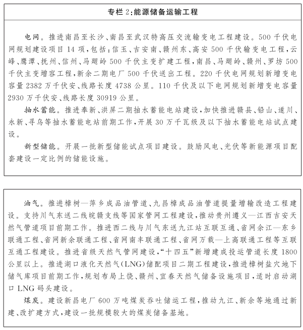电力方面。加快融入华中特高压主干电网,推进南昌至长沙、南昌至武汉特高压交流工程建设,“十四五”新增特高压交流变电容量600万千伏安、线路800公里左右。坚持网源统筹、协调发展,继续完善500千伏骨干电网建设,构建形成“1个中部核心双环网+3个区域电网”①主干网架,“十四五”新增变电容量1075万千伏安、线路长度285公里。持续优化220千伏电网,加快实施500/220千伏电磁环网解环,降低电网运行风险。强化配电网建设,实施农网巩固提升工程,持续提升供电能力和电能质量。加强电力调峰能力建设,力争核准建设抽水蓄能电站4座以上,并为中长期发展储备一批站址资源。加快风电、光伏发电与新型储能融合发展,建设一批集中式电化学储能电站,探索开展其它形式储能示范。(①“1个中部核心双环网+3个区域电网”:指永修—梦山—锦江—安源—孔目江—罗坊—抚州—鹰潭—乐平—南昌—永修500千伏中部核心双回环网和北部、东部、南部三个500千伏区域电网。)