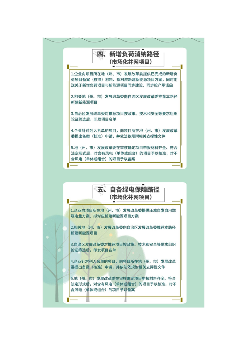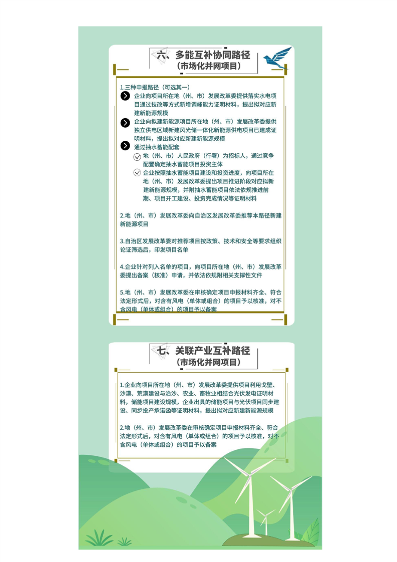 二是第(一)条路径中项目为保障性并网项目,光伏(向大电网送电)项目由自治区发展改革委备案,风电项目由地(州、市)发展改革委核准;第(二)(三)(四)(五)(六)条路径中项目,为通过源网荷储一体化、多能互补等方式建设的市场化并网项目。根据《国家发展改革委 国家能源局关于完善能源绿色低碳转型体制机制和政策措施的意见》(发改能源〔2022〕206号)中“深化能源领域‘放管服’改革,优化清洁低碳能源项目核准和备案流程”精神,自治区发展改革委经组织国家能源局新疆监管办、自治区自然资源厅、生态环保厅、国网新疆电力有限公司等相关部门和单位,按政策、技术和安全等要求论证,将符合要求的项目列入自治区项目名单后,统一由地(州、市)发展改革委核准(备案);第(七)条路径中项目为市场化并网项目,由各地(州、市)发展改革委核准(备案)。