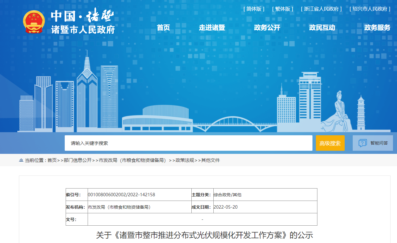 根据国家和省能源局统一部署要求,为加快推进光伏产业发展,充分发挥新能源在能源供应保障、能源双控调节中的作用,确保如期实现“碳达峰、碳中和”战略目标,我局起草了《诸暨市整市推进分布式光伏规模化开发工作方案》(草案),现公示如下:
