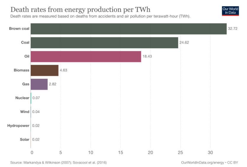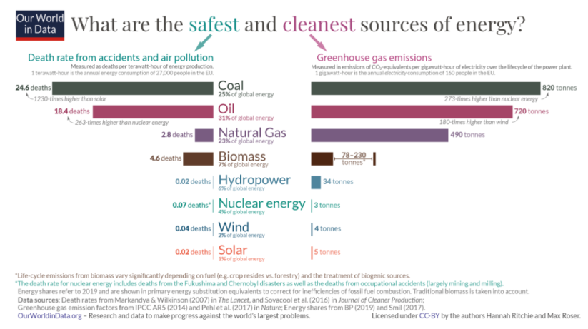 任何能源都有负面影响,但在规模上存在巨大差异:在所有三个方面,化石燃料都是最脏、最危险的,而核能和现代可再生能源则更安全、更清洁。