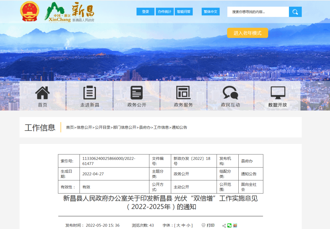5月20日,浙江新昌县人民政府办公室关于印发新昌县光伏“双倍增”工作实施意见(2022-2025年)的通知。