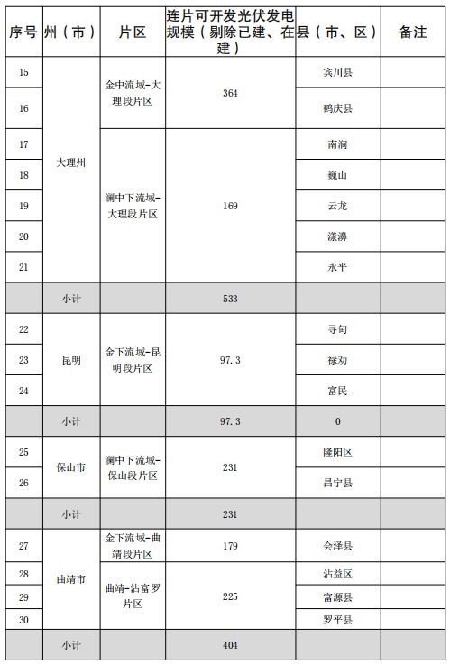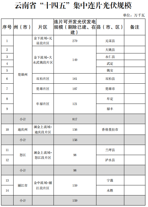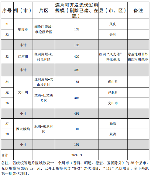 5月12日,云南省发展和改革委员会、云南省能源局就《云南省省级统筹连片光伏资源市场化配置方案》公开征求意见。根据意见稿,云南省“十四五”可再生能源规划按照集中开发、规模化开发原则,以光伏资源丰富的县(市、区)为划分基础,形成省级统筹管理的19个连片光伏资源区,涉及十二个州市(普洱、昭通、德宏、玉溪除外)的38个县市,光伏规模为3639万千瓦。已开工规模包含“8+3”光伏项目、“445”光伏项目、金下基地第一批光伏项目。