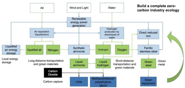 示范区旨在推动形成绿色低碳化工产业链,实现冶金、化工等行业的全面碳中和。通过建设500万KW风力发电机组和150万KW光伏发电机组,绿色氢的年生产能力预计将达到30万吨。中国第一套2×550000吨的直接还原铁高炉将使用绿色氢作为还原剂。同时,以绿色氢和空气捕获氮为原料,项目还包括了年产能120万吨的绿色合成氨。