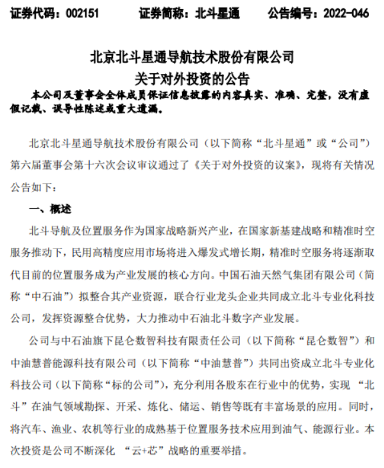 5月25日,北斗星通(002151)公告,公司与中石油旗下昆仑数智科技有限责任公司(以下简称“昆仑数智”)和中油慧普能源科技有限公司(以下简称“中油慧普”)共同出资成立北斗专业化科技公司(以下简称“标的公司”),充分利用各股东在行业中的优势,实现“北斗”在油气领域勘探、开采、炼化、储运、销售等既有丰富场景的应用。