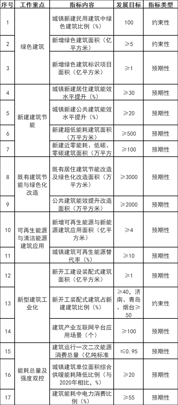 在发展目标方面,针对绿色建筑、新建建筑节能、既有建筑节能与绿色化改造、可再生能源与清洁能源应用、新型建筑工业化、能耗总量及强度双控等6个方面,《发展规划》提出了17项量化指标。其中,约束性指标3项。