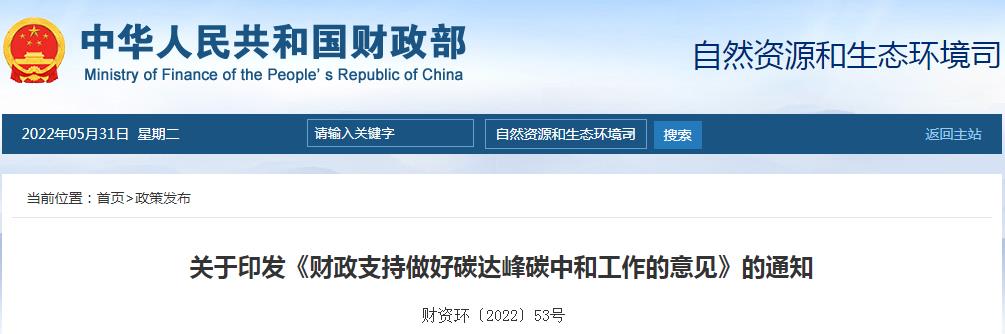 为贯彻落实党中央、国务院关于推进碳达峰碳中和的重大决策部署,充分发挥财政职能作用,推动如期实现碳达峰碳中和目标,现将《财政支持做好碳达峰碳中和工作的意见》印发给你们,请遵照执行。