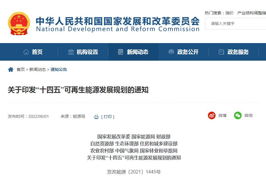 6月1日,发改委等九部门印发“十四五”可再生能源发展规划的通知。