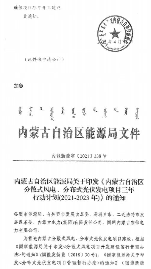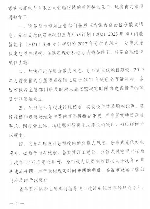 在当年建设计划规模内的分散式风电、分布式光伏发电项目必须于当年核准、备案并开工建设,分散式风电项目必须于次年12月底建成并网,分布式光伏发电项目必须于次年6月底建成并网,对于未按规定时间并网的项目,各盟市能源主管部门应及时予以废止。