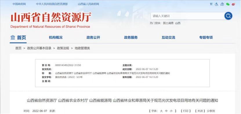 6月7日,山西省自然资源厅官网公示了由山西省自然资源厅、山西省农业农村厅、山西省能源局、山西省林业和草原局联合发布的《关于加强光伏发电项目用地支持保障》的通知。对山西省的光伏用地进行了政策层面的支撑保障。