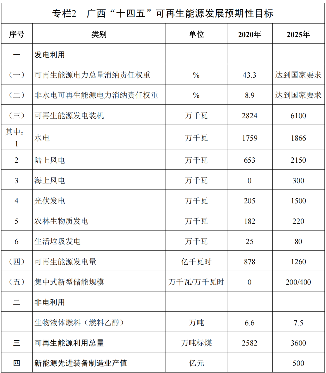 6月6日,广西发布《可再生能源发展“十四五”规划》,规划针对可再生能源“十四五”期间提出具体总目标:“至2025年,可再生能源并网装机规模达到6100万千瓦;可再生能源发电量达到1260亿千瓦时;可再生能源消费总量达到3600万吨标准煤,占能源消费总量的25%;可再生能源消费增量在能源消费增量中的比重逐步提高。”