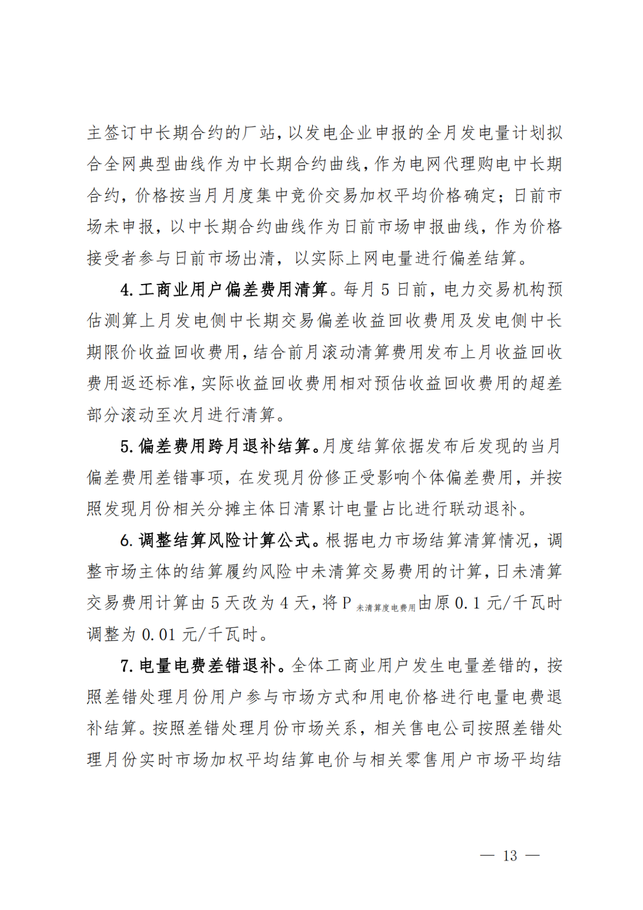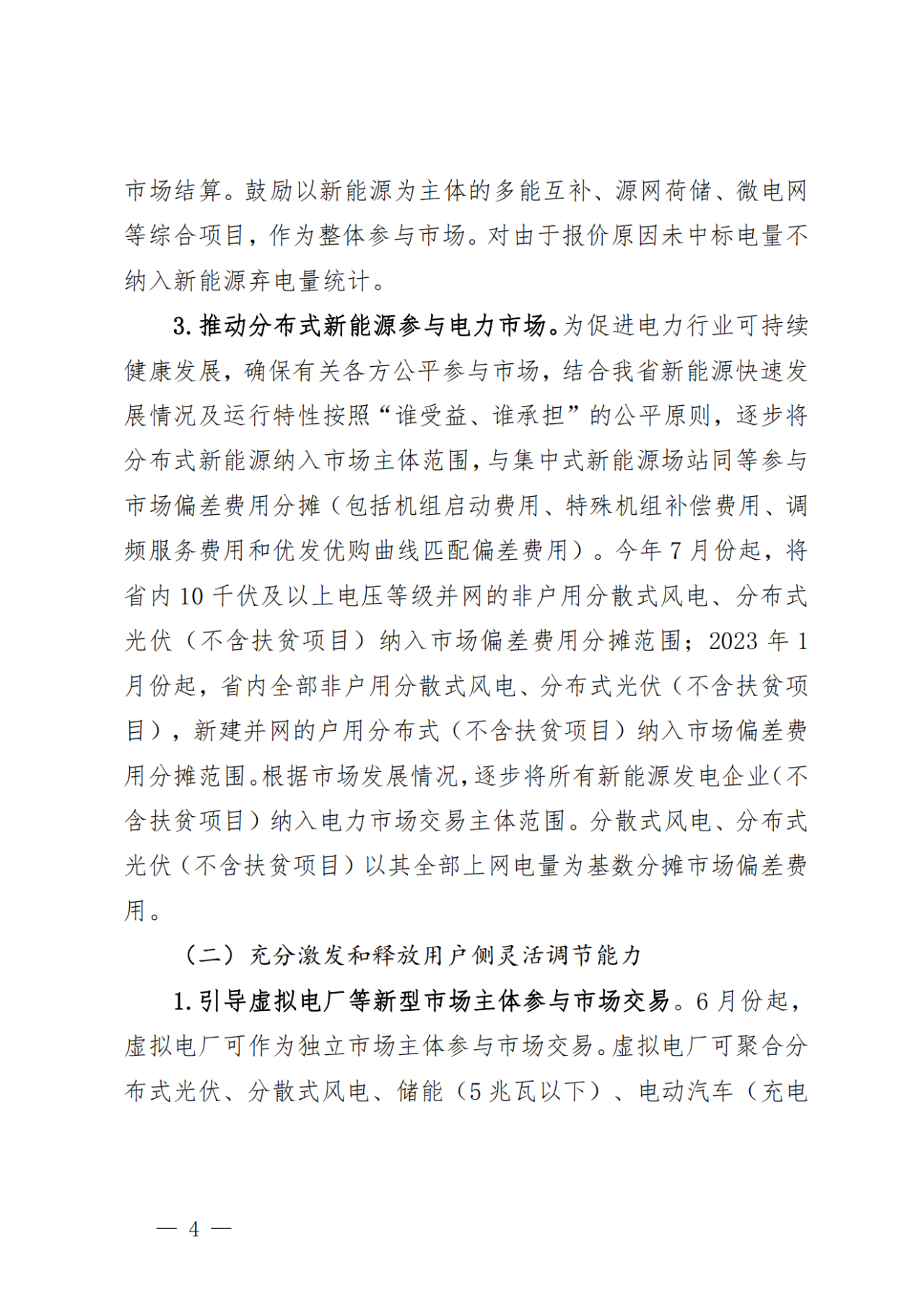 自今年7月份起,将省内10千伏及以上电压等级并网的非户用分散式风电、分布式光伏(不含扶贫项目)纳入市场偏差费用分摊范围(包括机组启动费用、特殊机组补偿费用、调频服务费用和优发优购曲线匹配偏差费用)。明年1月起,省内非户用风光分布式以及新建的户用分布式(不含扶贫)均纳入市场偏差费用分摊范围,后续逐步将所有新能源发电企业(不含扶贫项目)纳入电力市场交易主体范围,以其全部上网电量为基数分摊市场偏差费用。