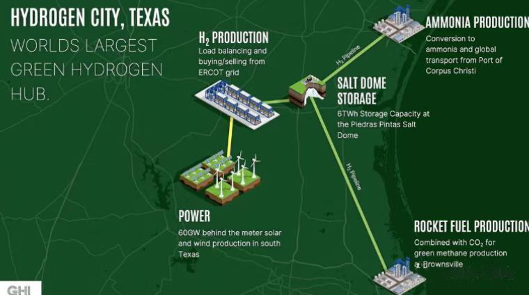 美国的一家初创企业GHI(Green Hydrogen International)将在得克萨斯州建造全球最大的绿氢项目,计划以60GW的太阳能和风电、盐穴储能系统制造氢气。
