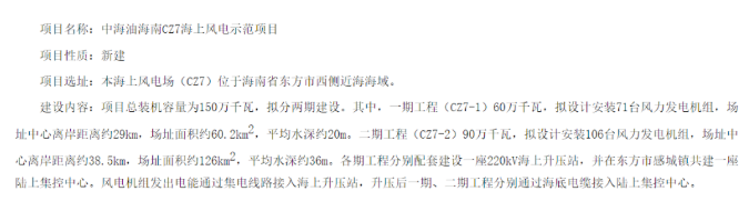 示范项目二:场址东方CZ7容量150万千瓦,项目主体为中海油集团;建设单位为中海油(海南)新能源有限公司。