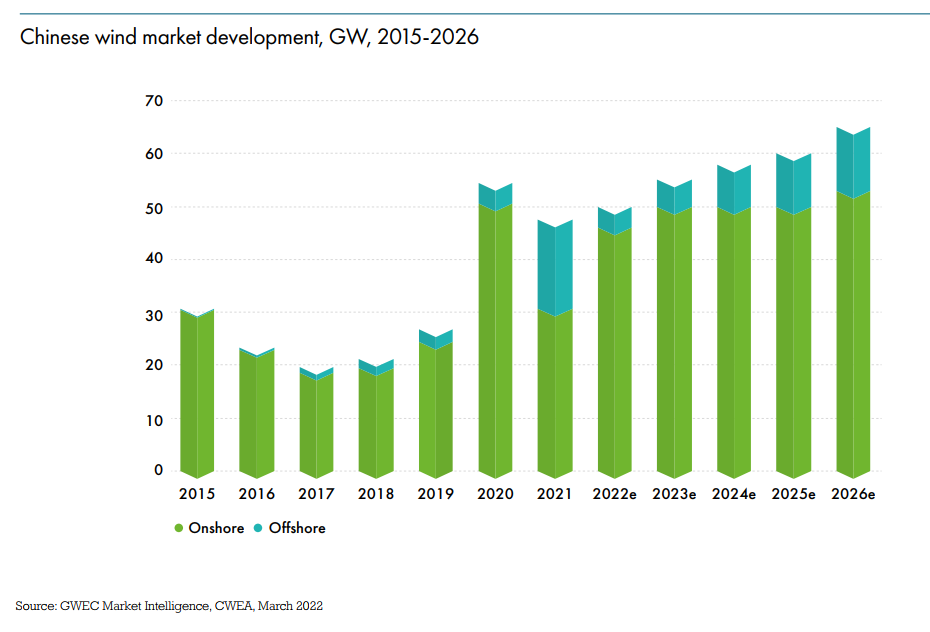 GWEC预测数据显示,到2026年中国风电年新增装机将超过60GW,其中陆上风电超过50GW,海上风电超过10GW。