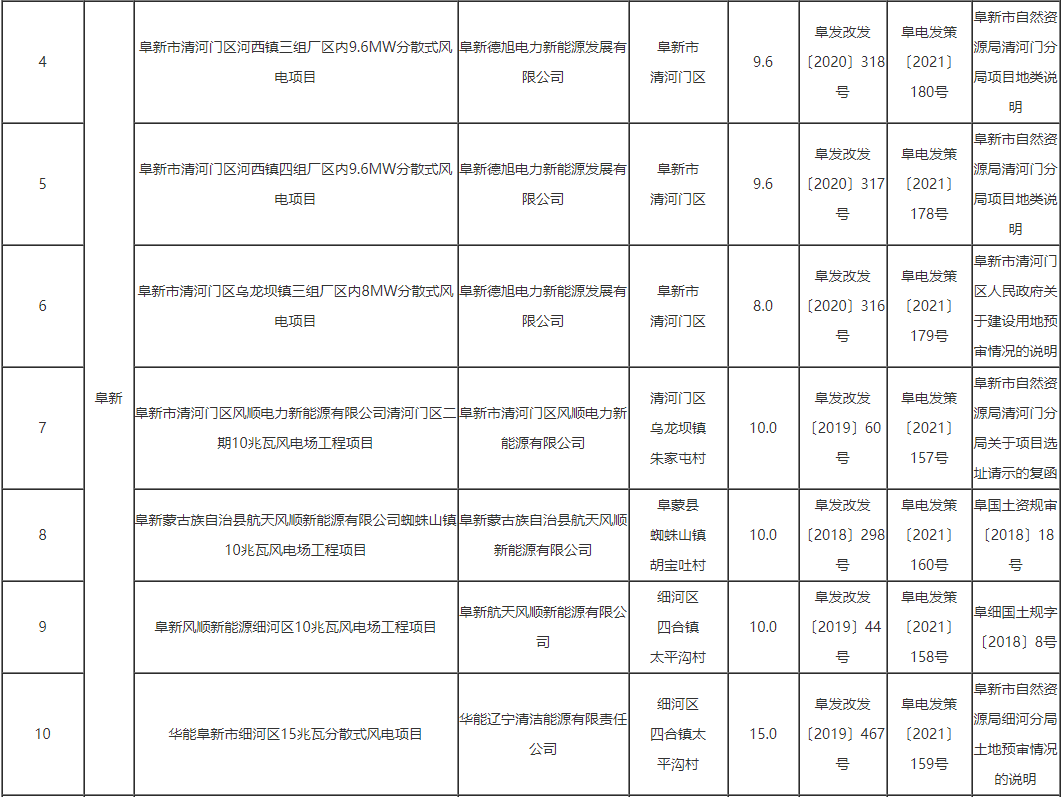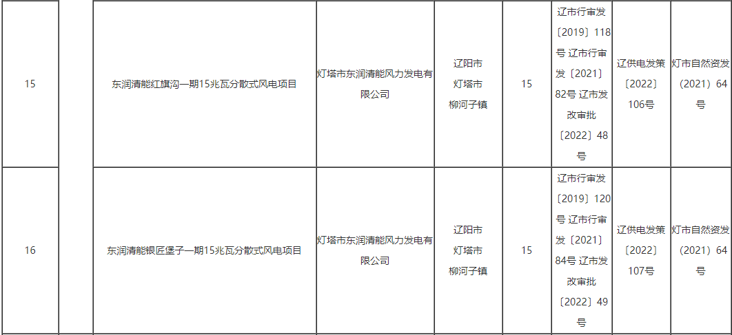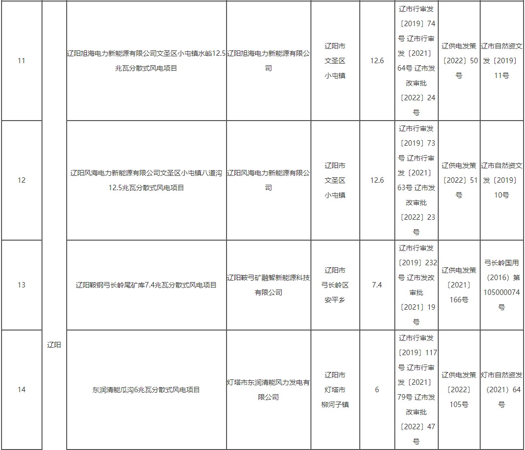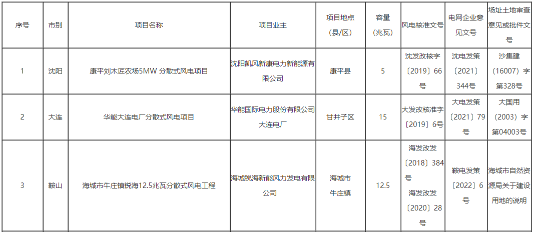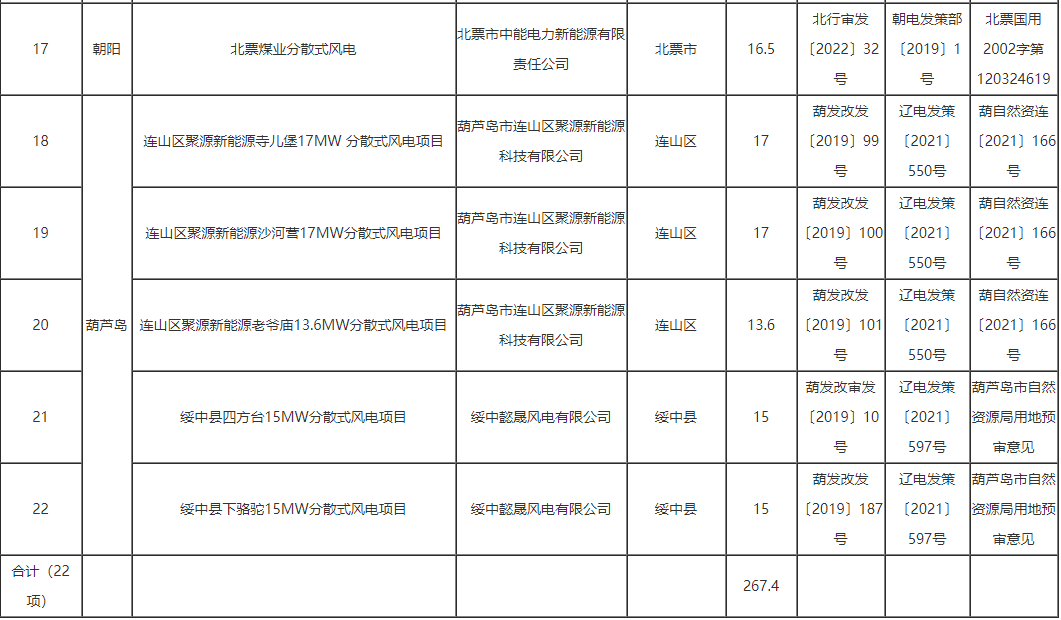 辽宁省2022年拟列入分散式风电建设方案项目清单公示