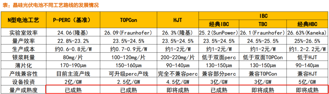 在这样的背景下,市场对高效电池片的需求提升,TOPCon、HJT高效电池片技术路线也由此逐渐发展成熟,且转换效率提升空间大,性价比优势逐渐显现,目前已逐步进入大规模产业化阶段。