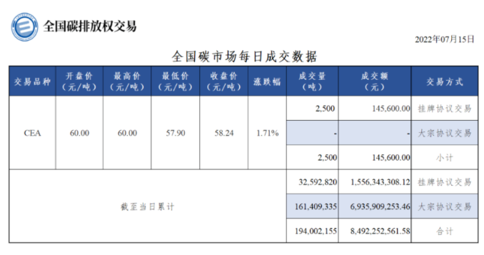 7月16日,全国碳排放交易市场迎来上市一周年。上海方面发布了一系列数据,截至2022年7月15日收盘,全国碳市场碳排放配额(CEA)累计成交量约1.94亿吨,累计成交额84.92亿元。上海环境能源交易所董事长赖晓明称,经过一年的建设,全国碳市场已成为全球最大的碳现货二级市场。