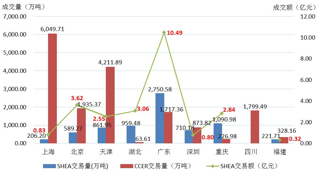 各区域市场2021年碳排放配额及CCER(国家核证自愿减排量)交易数据。
