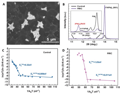 图1、(A)具有PIRC二次相钙钛矿的扫描电子显微镜照片,(B)有无PIRC的钙钛矿薄膜X射线衍射图谱(插图为局部放大图),(C)与(D)分别为有无PIRC的钙钛矿电导与温度关系图。