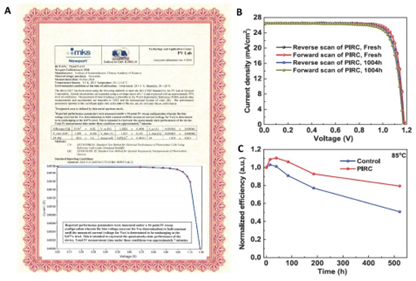 图2、(A)第三方权威机构美国Newport认证书,认证效率为25.6%,插图为认证效率曲线,(B)有无稳定二次相PIRC器件放置的电流-电压曲线,(C)有无稳定二次相PIRC器件在85℃加速老化下的稳定性。