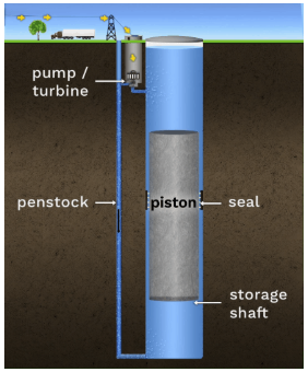 活塞式储能,可以看做一个“水电池”,按采矿业的标准技术挖出竖井,在竖井中建造一个由加固岩石制成的活塞,在竖井中添加水并密封,形成一个闭环系统。当电力富裕时,由水泵水轮机抽水加压,提升活塞,存储能量;发电时,活塞下落,其势能传递给水流,由水泵水轮机转换为机械能带动发电机发电。