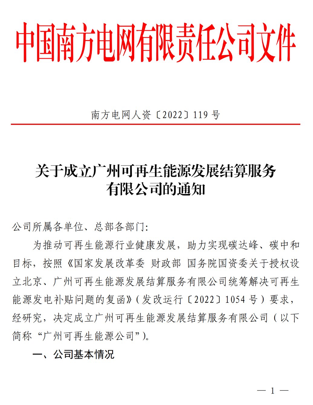 8月11日,中国南方电网有限责任公司发布《关于成立广州可再生能源发展结算服务有限公司的通知》,为助力实现碳达峰、碳中和目标,按照《国家发展改革委 财政部 国务院国资委关于授权设立北京、广州可再生能源发展结算服务有限公司统筹解决可再生能源发电补贴问题的复函》要求,研究成立广州可再生能源发展结算服务有限公司。